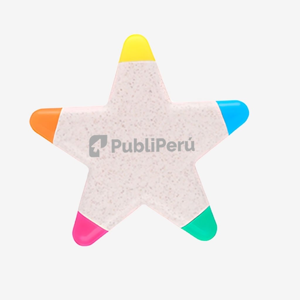 - Descripción: Resaltador en forma de estrella con 5 puntas. Colores Anaranjado, Verde, Amarillo, Turqueza y Rosado.